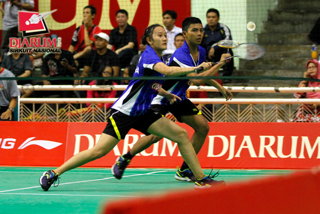 Aji Firmansyah/Bunga Fitriani (Mutiara Bandung) berusaha mengembalikan shuttlecock ke arah Andika Ramadiansyah/Marsheilla Gischa (PB Djarum).