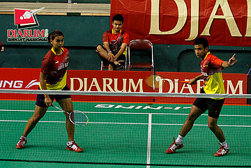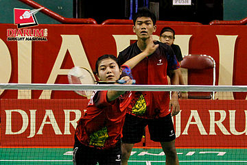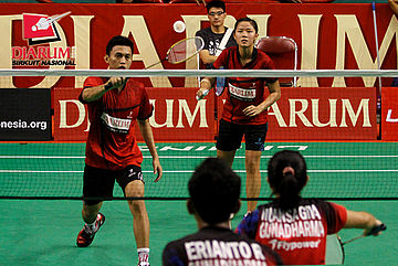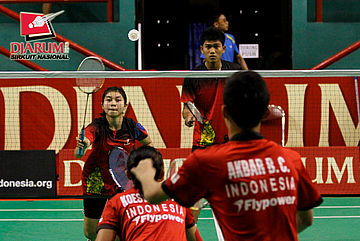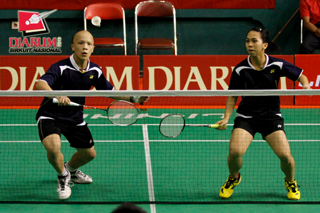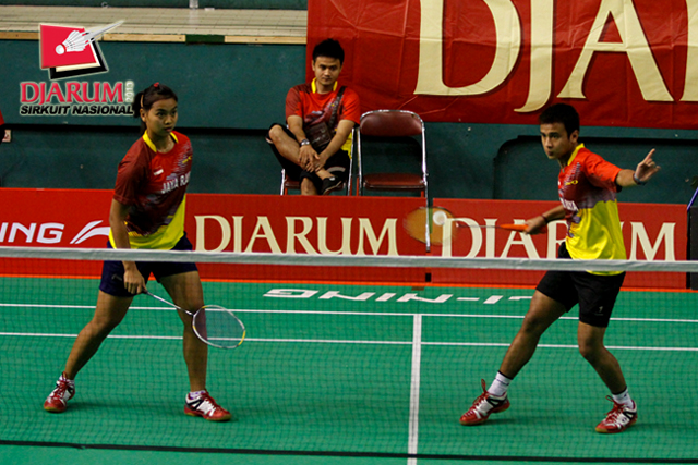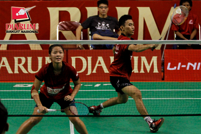 Tedi Supriadi/Jessica Shohan Koesworo (DJARUM) terima serve dari Riki Erianto/Nuansa Giva (GUNA DHARMA BANDUNG).