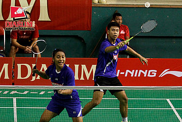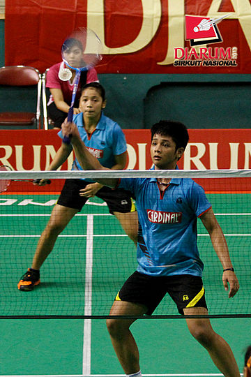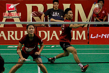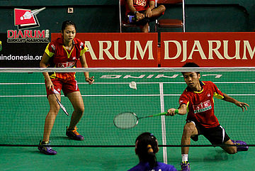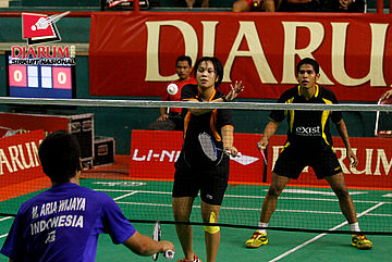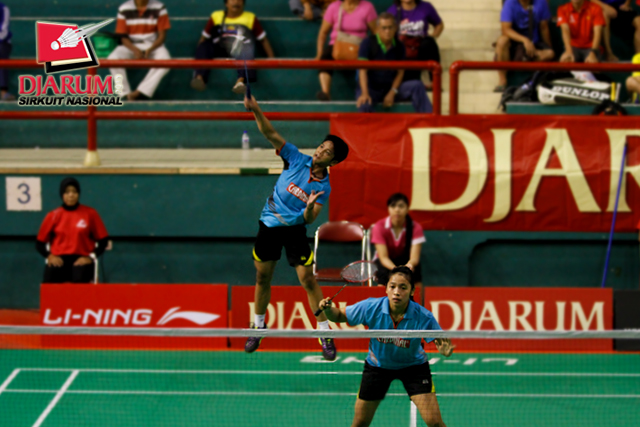 Riki Erianto/Nuansa Giva (GUNA DHARMA BANDUNG) terima serve dari Tedi Supriadi/Jessica Shohan Koesworo (DJARUM).