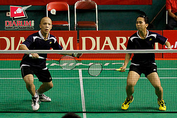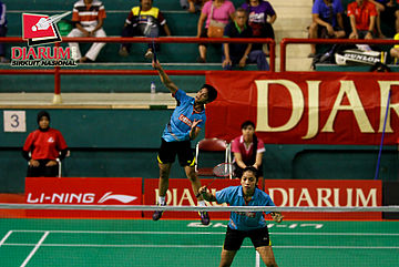 Engga Nur Hanafi/Vina Elsa S (JAYA RAYA JAKARTA)mengembalikan smash dari Ryan Sauqi/Monika Intan Tutiharta (MUTIARA BANDUNG).