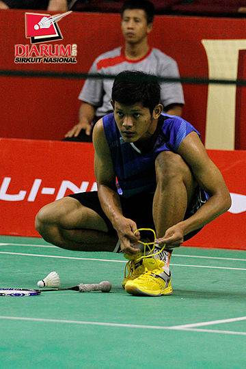 Rizky Antasari (HIQUA WIMA) mengencangkan tali sepatu.