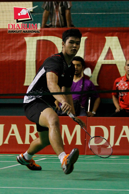 Christeven Howard (CANDRA WIJAYA) mencoba menggapai shuttlecock.