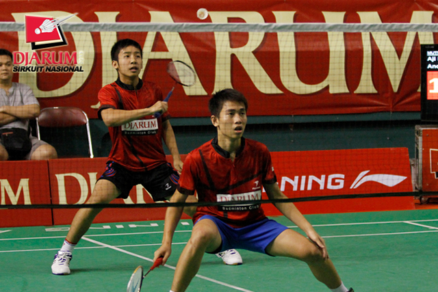 Andre Pinastika R/Calvin Kristanto (DJARUM)mengembalikan shuttlecock ke arah Aji Firmansyah/Andre Suryo P (MUTIARA BANDUNG).