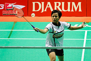 Rosaria Yusfin (PB Djarum) mengembalikan shuttlecock ke arah Rina Andriani (Suluh).