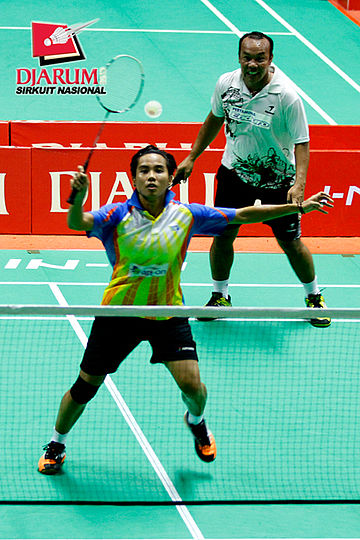 Alamsyah Yunus (Pertamina Indonesia) bersiap mengembalikan shuttlecock ke arah I Made Asti (Jaya Agung Magelang).