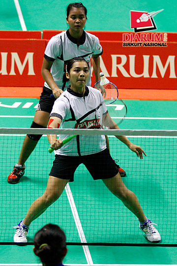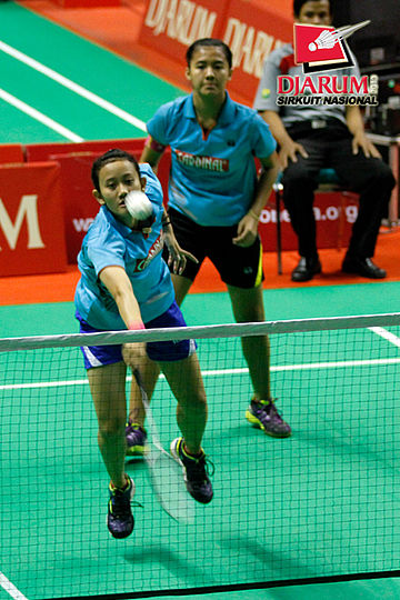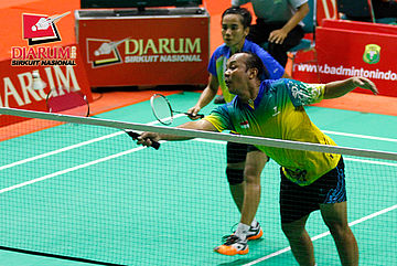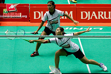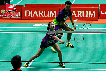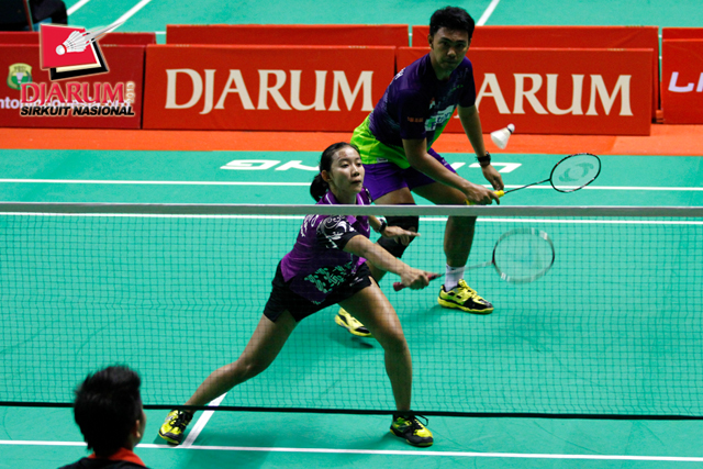Trikus Haryanto/Nadya Melati (Pertamina Indonesia) menyambar pengembalian dari pasangan Yodhi Satrio/Ni Ketut Mahadewi (Jaya Raya Suryanaga).