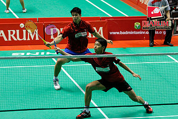 Hantoro/Ricky Alverino (PB Djarum) berusaha menggapai pengembalian dari Franky Wijaya/Sabar Karyaman (Exist).