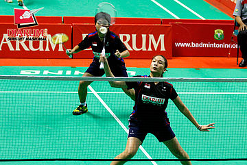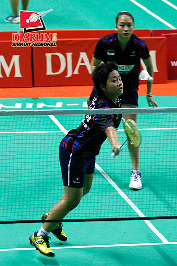 Bunga Fitriani/Mayrina Lukmanda (Mutiara Bandung) menyambar pengembalian dari Cynthia Shara/Felicia Parmenas (PB Djarum).