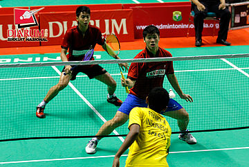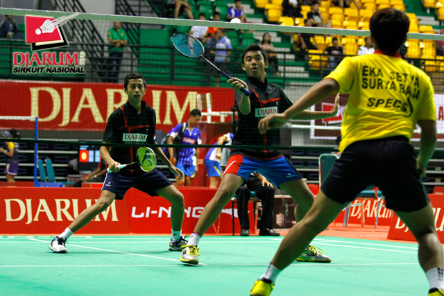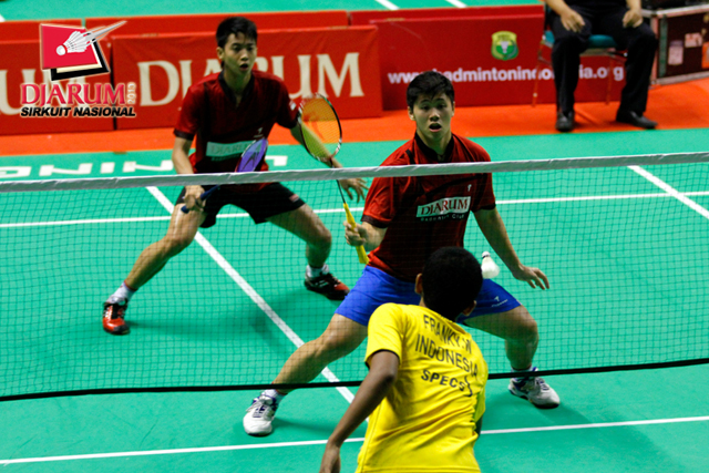 Hantoro/Ricky Alverino (PB Djarum) bersiap menyambut pengembalian shuttlecock dari Franky Wijaya/Sabar Karyaman (Exist).