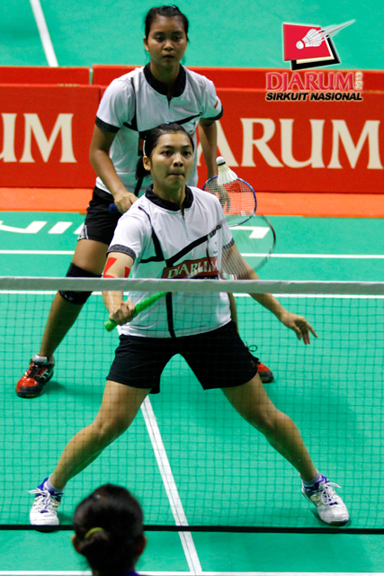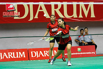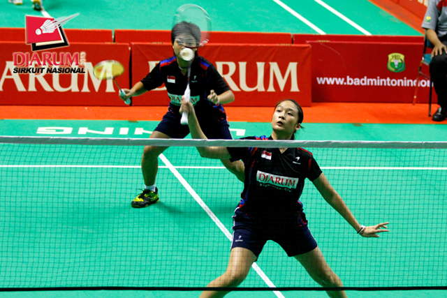 Chintia Rhizta/Ristya Ayu (PB Djarum) berhasil mengembalikan shuttlecock ke arah pasangan Jovita Evania/Novalita Anggraeni (Mutiara Bandung).