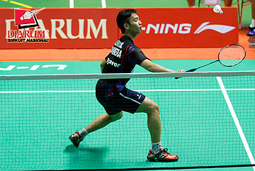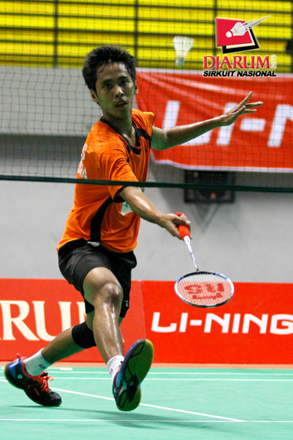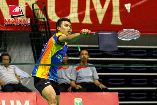 Eka Fajar (Jaya Raya) mengembalikan shuttlecock ke arah Panji Ahmad (Mutiara Bandung).