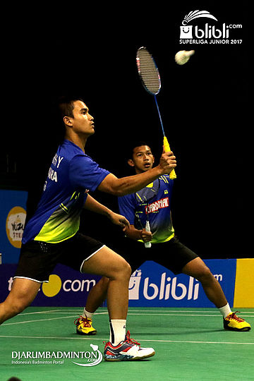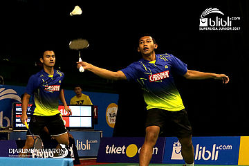 Helmi Yudha Arrafi/Peter Mandala Surya Sumardi (Mutiara Cardinal) Mengembalikan Shuttlecock