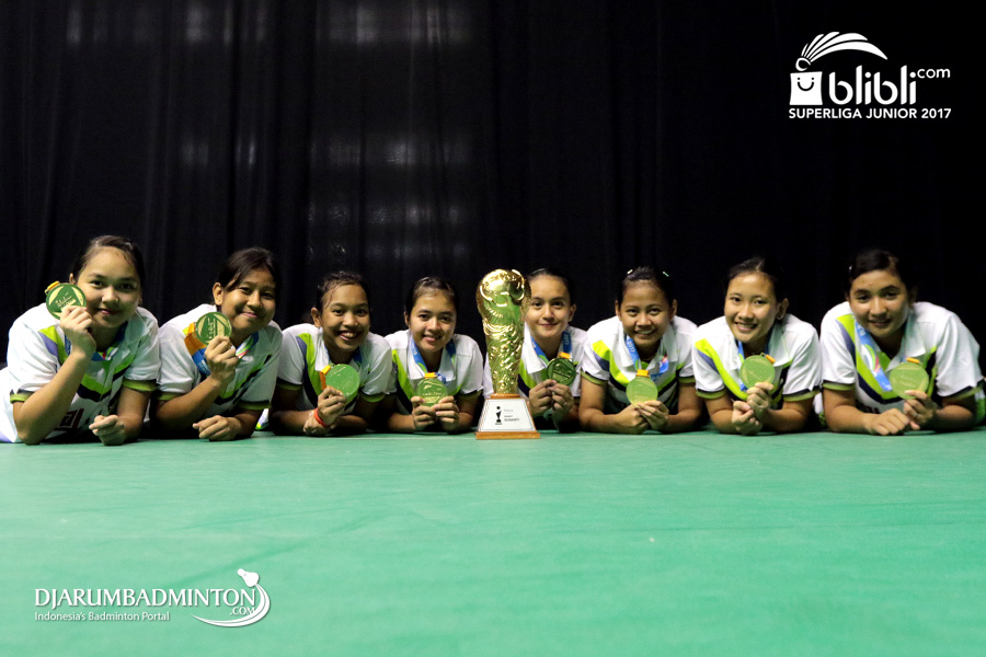 Tim Putri U-19 Jaya Raya Jakarta Berfoto Bersama Trofi Dan Medali Emas Blibli.com Superliga Junior 2017 'Susy Susanti'
