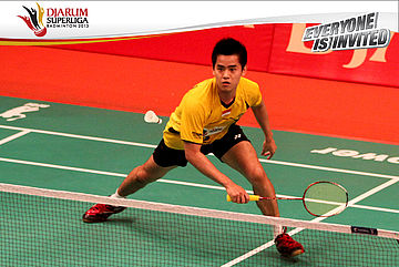 Tanongsak Saensomboonsuk (Jaya Raya) menyambut serve dari Chong Wei Feng (Malaysia Tigers)