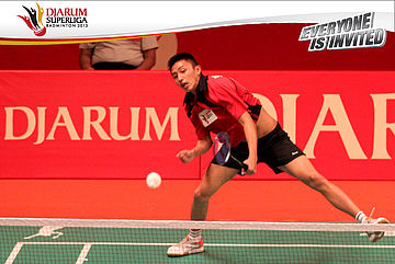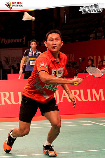 Tommy Sugiarto (PB Musica Champion) berusaha menggapai kok pengembalian dari Boonsak Ponsana (Jaya Raya)