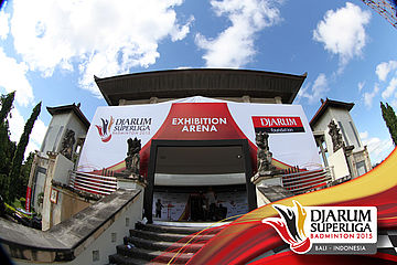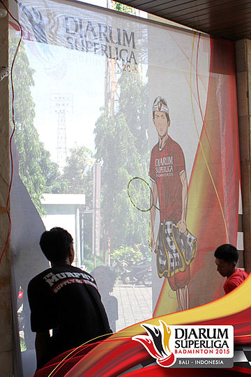 Beberapa ikon Djarum Superliga Badminton 2015 siap menghiasi pintu masuk GOR Lila Bhuana.