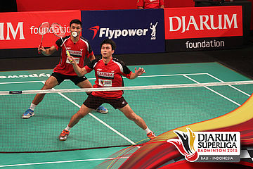 Rian Agung/Trikusuma Wardhana (Jaya Raya Suryanaga) berusaha menggapai pengembalian dari Berry Angriawan/Mohammad Ahsan (Djarum Kudus).