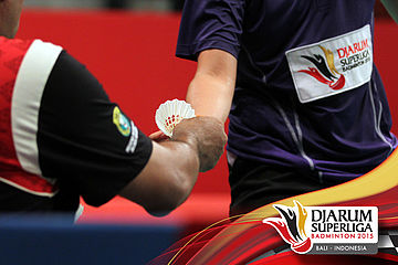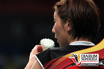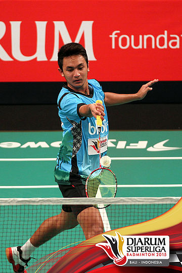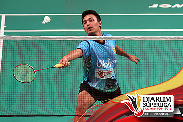 Thomi Azizan (USM Blibli) mengembalikan shuttlecock ke arah Sho Sasaki (Tonami Jepang).