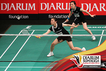 Miyuki Maeda/Reika Kakiiwa (Renesas Jepang) memberikan isyarat saat berhadapan dengan Apriyani Rahayu/Jauza Fadhila (Jaya Raya New Star).