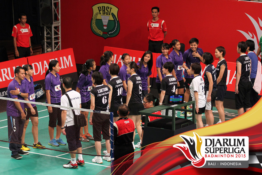 Tim Jaya Raya New Star (kiri) saat bersalaman dengan tim Renesas Jepang.