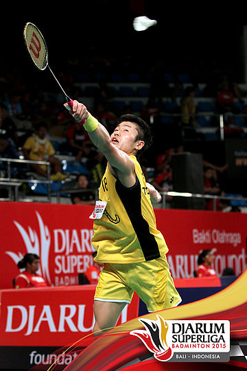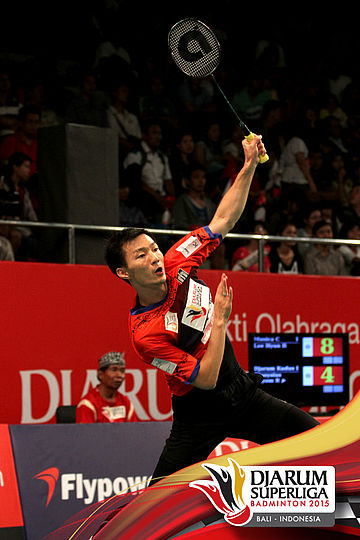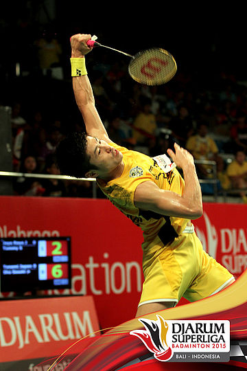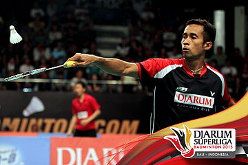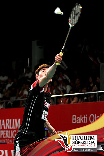 Simon Santoso (Musica Champion) mengembalikan shuttlecock ke arah Son Wan Ho (Djarum Kudus).53. Simon Santoso (Musica Champion) mengembalikan shuttlecock ke arah Son Wan Ho (Djarum Kudus).