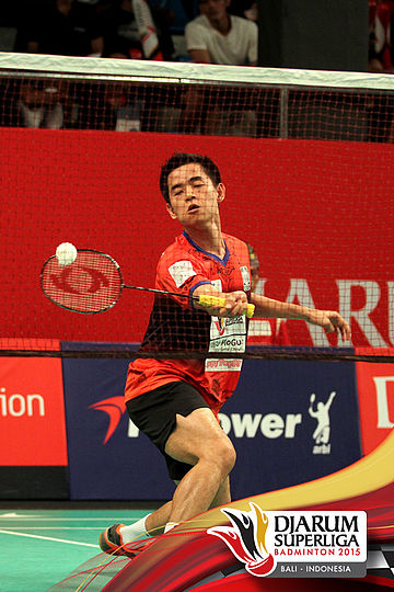 Tommy Sugiarto (Jaya Raya) mengembalikan shuttlecock ke arah Sho Sasaki (Tonami Jepang).