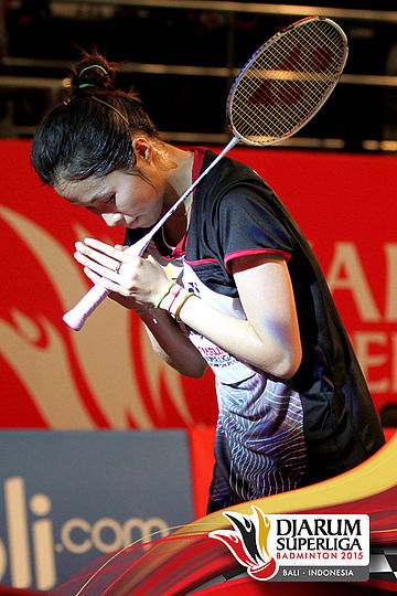 Ratchanok Intanon (Jaya Raya) memberikan salam saat memiminta pergantian shuttlecock.