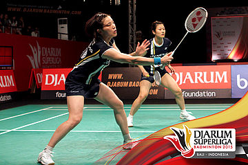 Miyuki Maeda/Reika Kakiiwa (Renesas Jepang) bersiap menyambut pengembalian dari Pia Zebadiah/Rizki Amelia (Jaya Raya).