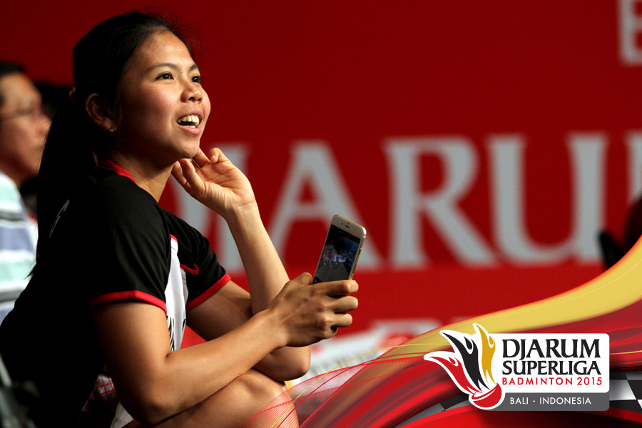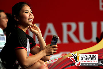 Greysia Polii (Jaya Raya) terpukau melihat dukungan yang diberikan seluruh penonton di GOR Lila Bhuana kepada timnya.
