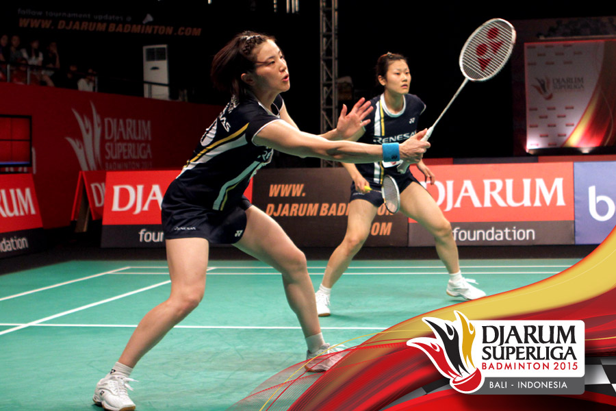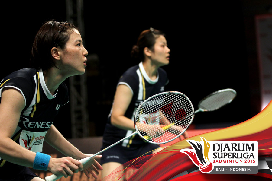 Miyuki Maeda/Reika Kakiiwa (Renesas Jepang) menghadang serangan yang dilepaskan Pia Zebadiah/Rizki Amelia (Jaya Raya).