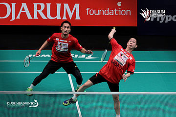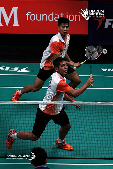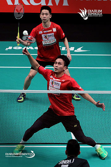 Mohammad Ahsan/Kevin Sanjaya (PB Djarum) mengembalikan shuttlecock.