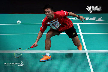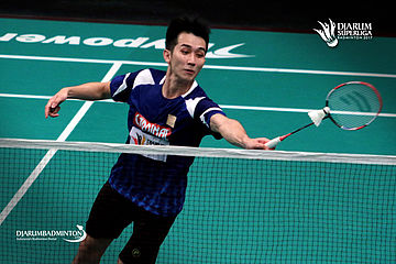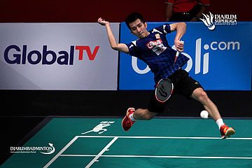 Chong Wei Feng (Mutiara Cardinal) melepaskan serangan.