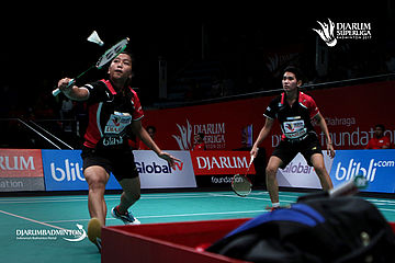 Ririn Amelia/Rosyita Eka Putri (PB Djarum) menghadang serangan.