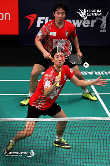 Kim Sa Rang/Lee Yong Dae (PB Musica Champion) menghadang serangan.