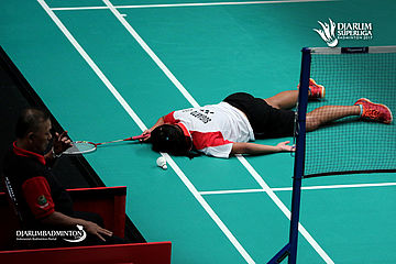 Marcus Fernaldi Gideon (PB Berkat Abadi) menangkap shuttlecock.
