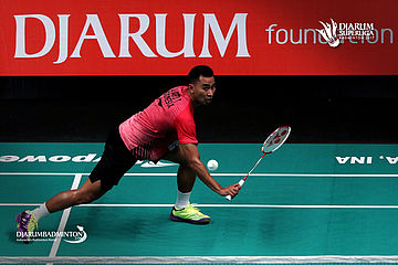 Jonatan Christie (PB Musica Champion) mengembalikan shuttlecock.