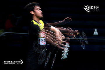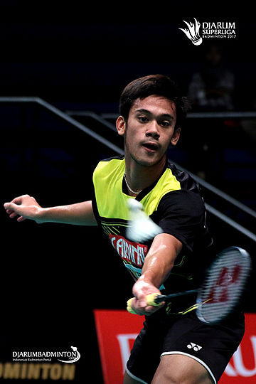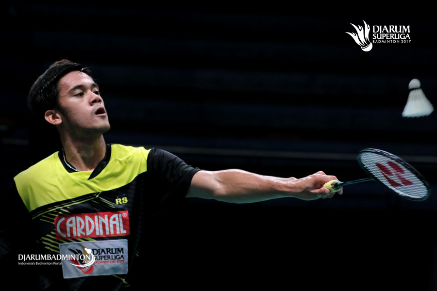 Firman Abdul Kholik (PB Mutiara Cardinal) mengembalikan shuttlecock.