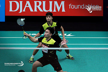 Akbar Bintang Cahyono/Bagas Maulana (USM Blibli.com) mengembalikan shuttlecock.