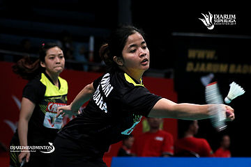 Maretha Dea Giovani/Suci Rizki Andini (PB Mutiara Cardinal) menyambut pengembalian.