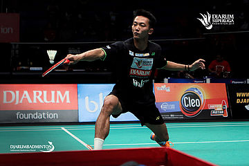 Sony Dwi Kuncoro (PB Berkat Abadi) mengembalikan shuttlecock.