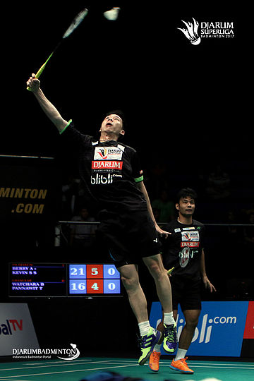 Berry Anggriawan/Kevin Sanjaya (PB Djarum) melepaskan serangan.