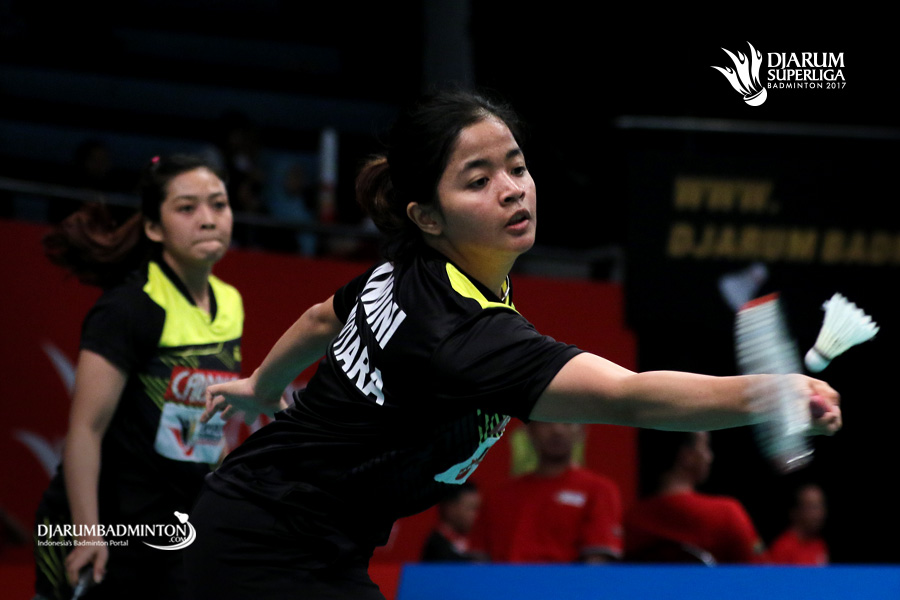 Maretha Dea Giovani/Suci Rizki Andini (PB Mutiara Cardinal) mengembalikan shuttlecock.