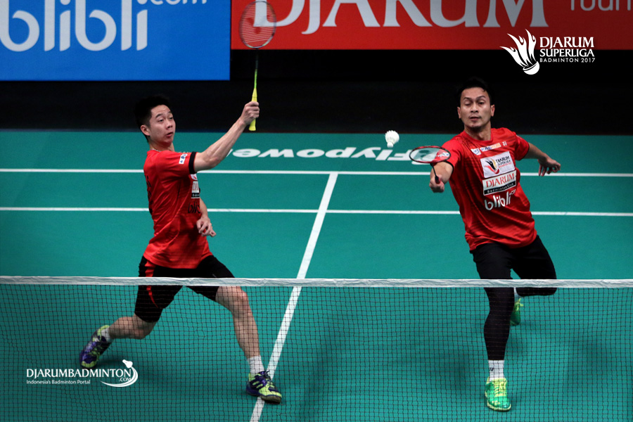 Mohammad Ahsan/Kevin Sanjaya (PB Djarum) menyambut pengembalian.