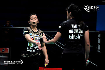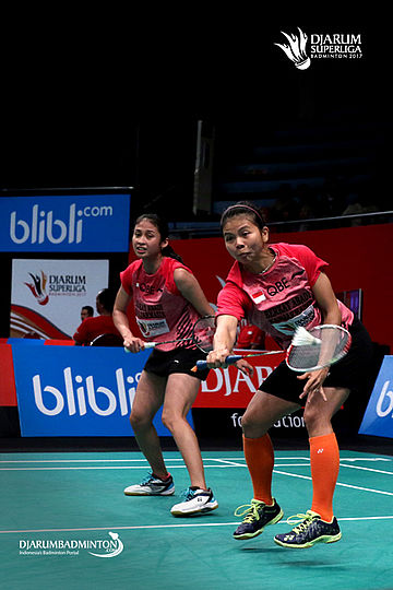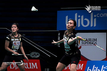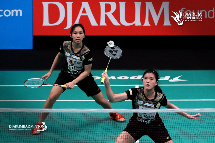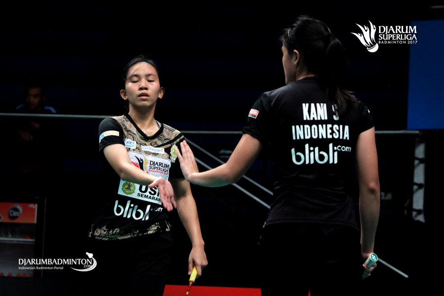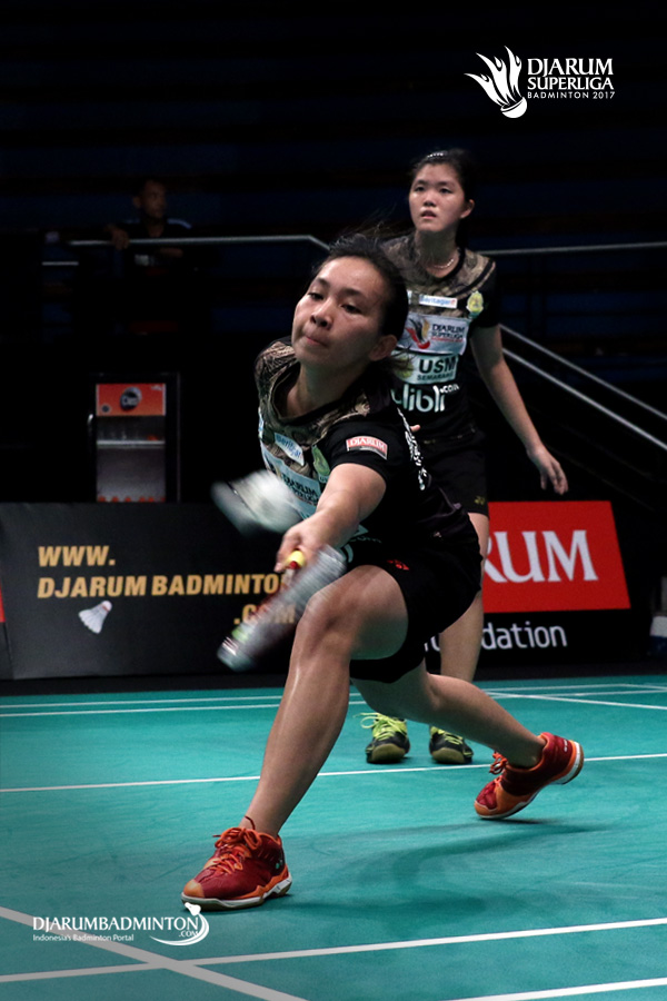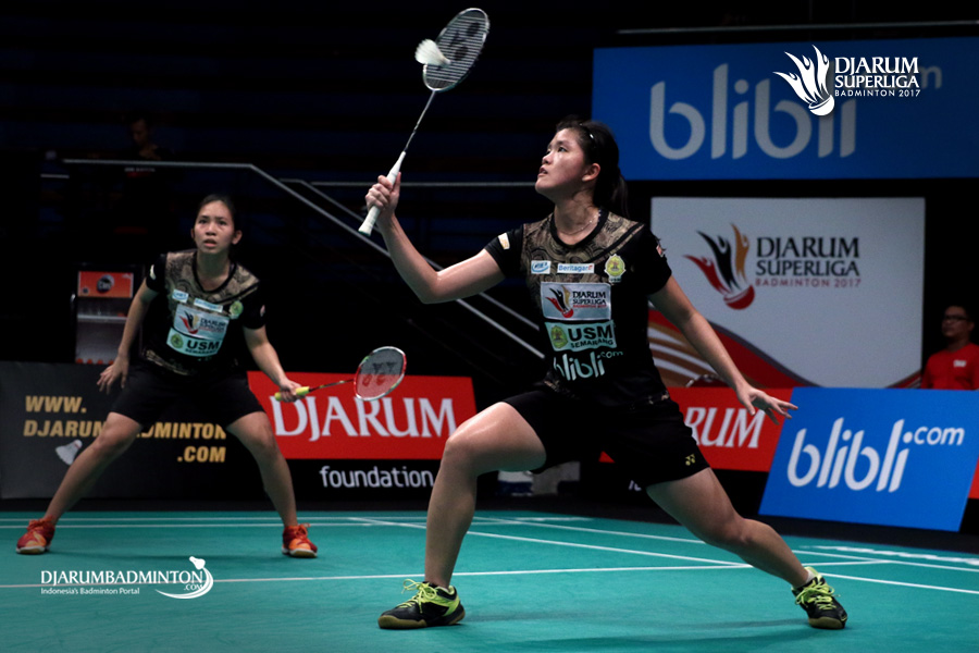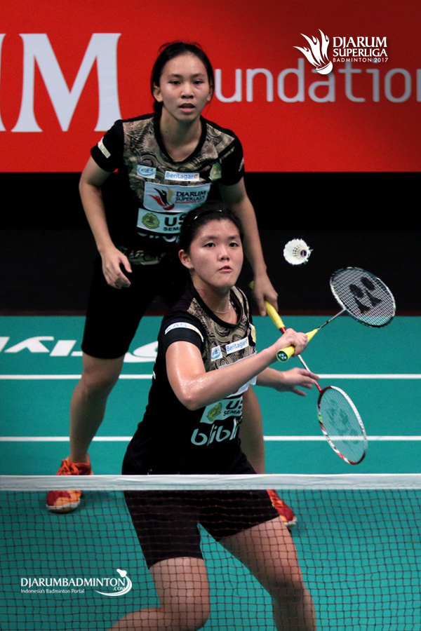 Mychelle Crhystine/Serena Kani (USM Blibli.com) bersiap menyambut pengembalian.