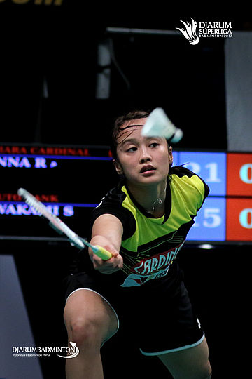 Hanna Ramadhini (PB Mutiara Cardinal) mengembalikan shuttlecock.