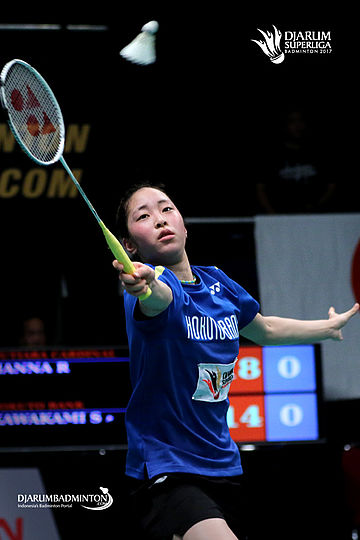 Kawakami Saena (Hokuto Bank Jepang) mengembalikan shuttlecock.