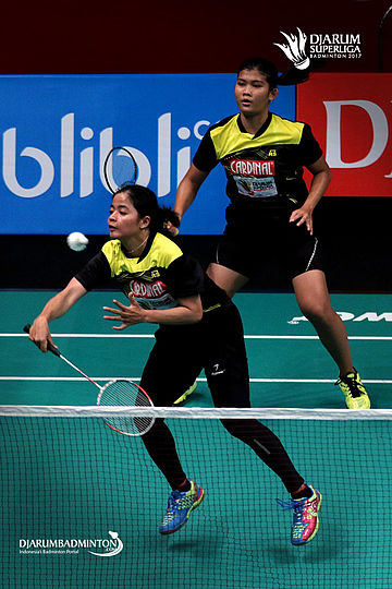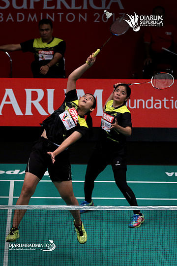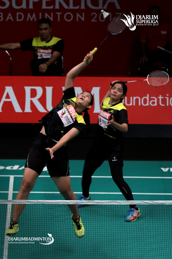 Nisak Puji/Tiara Rosalia (PB Mutiara Cardinal) menghadang serangan.