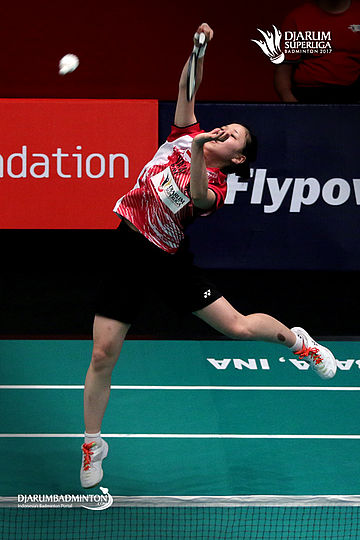Yasuda Miku (PB Tjakrindo Masters) melepaskan smash.