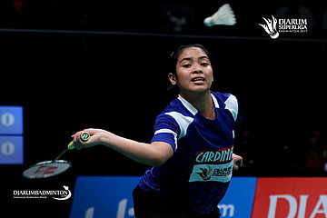 Gregoria Mariska (PB Mutiara Cardinal) bersiap menghadang serangan.