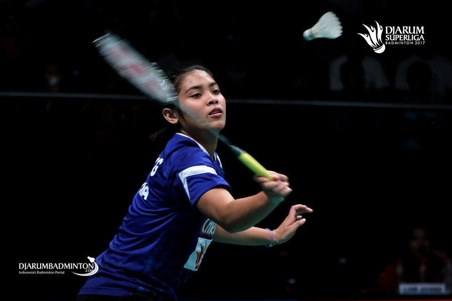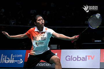 Gregoria Mariska (PB Mutiara Cardinal) bersiap menyambut pengembalian.